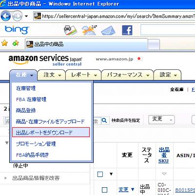 1.Amazonのseller centralページを開き、メニューの在庫>出品レコードをダウンロードをクリックします。