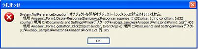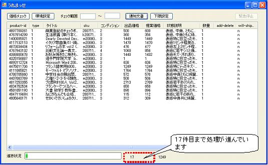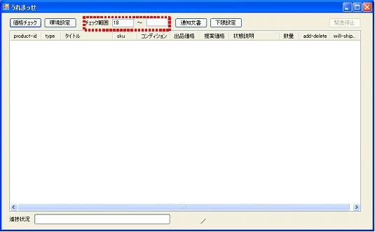 ■障害対処手順 発生頻度が高いと考えられる障害への対処方法を説明します。 ![]() 1.Amazonとの通信障害が発生すると上記のエラーメッセージが表示されます。 このメッセージが発生した場合、処理を続行することは不可能になります。 ![]() 2.何件目まで処理が進んだかを控え、うれまっせを一旦終了します。 3.途中までの価格改定結果は既に出力されていますが、 障害発生以降の価格改定結果の出力先を別途指定します。 (出力先のファイルを作成、設置する必要があります) ![]() 4.うれまっせを再度起動します。メイン画面上部のチェック範囲フォームに、障害発生時の進捗件数+1の 数値を指定します。 画面の例では18件目から価格改定を再開します。 ※ちなみにチェック範囲フォームの二個目のエリアに数値を入力しますと、価格改定の 終了件数を指定することも可能です。 |